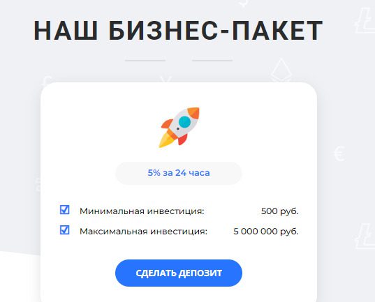 Для старта работы клиент должен пройти регистрацию на сайте и внести депозит. Минимальная сумма составляет 500 рублей, через сутки компания обещает начислить 5% прибыли. Такой доход обеспечен, по словам конторы, участием в выгодных схемах инвестирования: