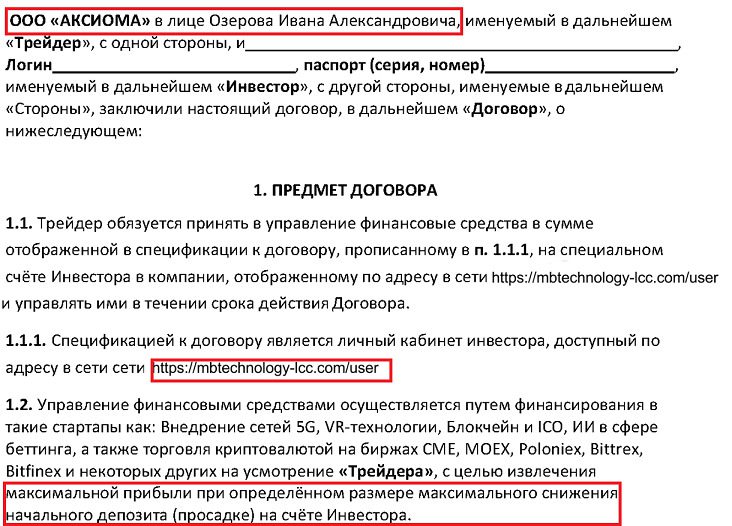 Компания MB Technology не стесняется рассказывать о партнерстве с гигантами криптоиндустрии, но никаких подтверждений этому нет. В договоре, который пользователь подписывает в начале работы, указано третье лицо — трейдер. Именно он обеспечивает своими действиями прибыль клиента и несет ответственность за убытки, но кто это, какие юридические отношения связывают трейдера и компанию или самого пользователя, в документе не указано. Получается, что в любом случае контора не несет ответственности за депозит клиента. ООО “Аксиома” гарантом сделки выступать не может, так как ее имя используется незаконно.