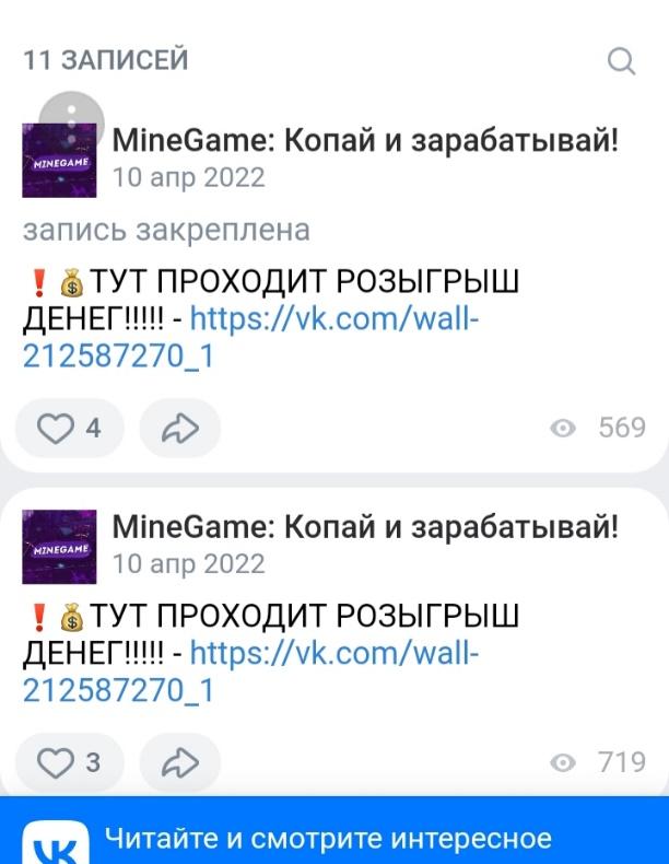 Вся работа проекта происходит в социальной сети ВКонтакте. По условиям, клиент должен обязательно присоединиться к группе. На данный момент Майн Гейм имеет 800 подписчиков. Посты публикуются крайне редко и в основном с рекламным характером. Призывают участвовать в розыгрышах и дублируют информацию. Также выкладывают фальшивые скриншоты, в которых виднеется как они якобы платят клиентам. Mine Game ВК заманивает пользователей приветственным бонусом в 1000 алмазов. Но по факту, чтоб перевести их в деньги, нужно вложить как минимум 100 рублей. Но после того, как игрок это сделает, его счет обнуляется. Привычный метод работы мошенников.Отзывы настоящих игроков Майн Гейм