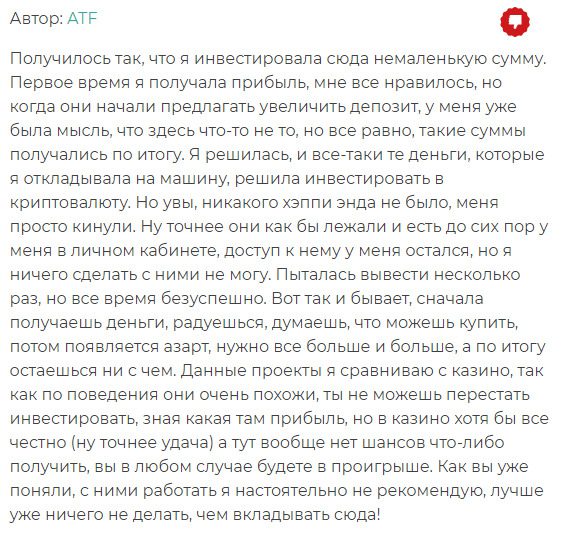 Администраторы обещают моментальный вывод средств, однако предупреждают, что могут возникать задержки до 48 часов. При выводе через BTC/ETH будет взиматься комиссионный сбор в размере 10%, а для Doge/LTC — 5%. Судя по отзывам, задержки возникают регулярно, а потом личные кабинеты пользователей оказываются заблокированными.