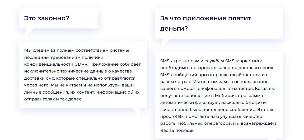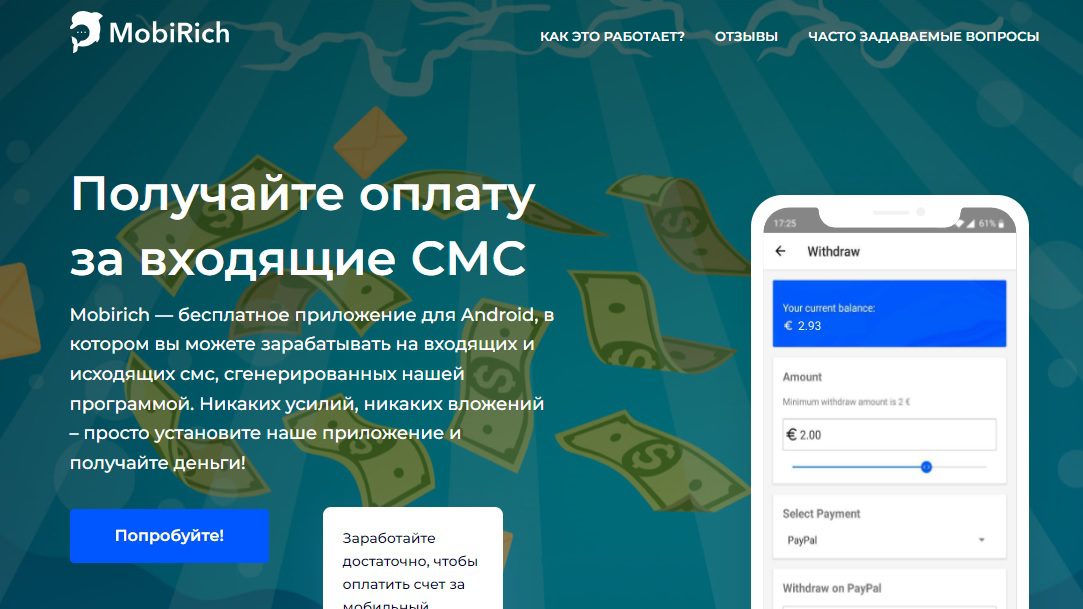 Mobi Rich — приложение для заработка на неиспользованных пакетах SMS-сообщений разных мобильных операторов. Разработчики гарантируют пассивный доход около 50 евро в месяц, а также полную конфиденциальность и защиту персональных данных. Можно ли доверять таким обещаниям или это очередной развод?