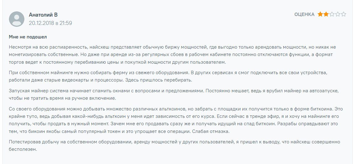 Nicehash считается одним из надежных сервисов с историей, начавшейся в 2014 году. Можно самостоятельно майнить или сдавать свои мощности в аренду. Выбор криптовалют ограничен, выплаты только в битке. Дважды сайт скомпрометировал себя, поэтому пользователи рекомендуют не держать крупные суммы на платформе. Клиенты сравнивают Nicehash с конкурентами и находят на других платформах более выгодные решения для майнинга, но признают преимущество алгоритмов именно на этой платформе. Отзывы неоднозначные. Есть свои плюсы и минусы. Бывалые утверждают, что если детально разобраться в сфере добычи крипты, то прибыльно майнить можно на любом сервисе, не только на Nicehash.