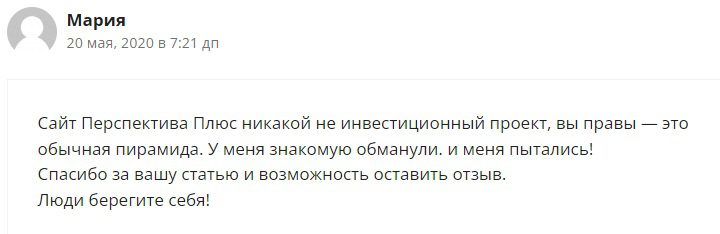 В сети немного отзывов о Перспективе плюс. Положительные комментарии явно были написаны на заказ или самими же админами проекта. В негативных же клиенты рассказывают о том, что это обычная финансовая пирамида, выманивающая деньги у пользователей.