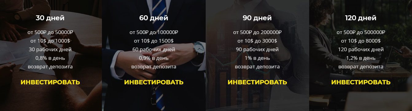 Инвесторам компания предлагает вкладывать средства на 30, 60, 90 и 120 дней. При этом процентная ставка варьируется в пределах 0,8-1,2% в день. Тело депозита возвращают по окончанию срока инвестирования, а выводить начисления можно ежедневно. Минимальный депозит составляет 500 рублей, а сумма на снятие — 300 рублей.