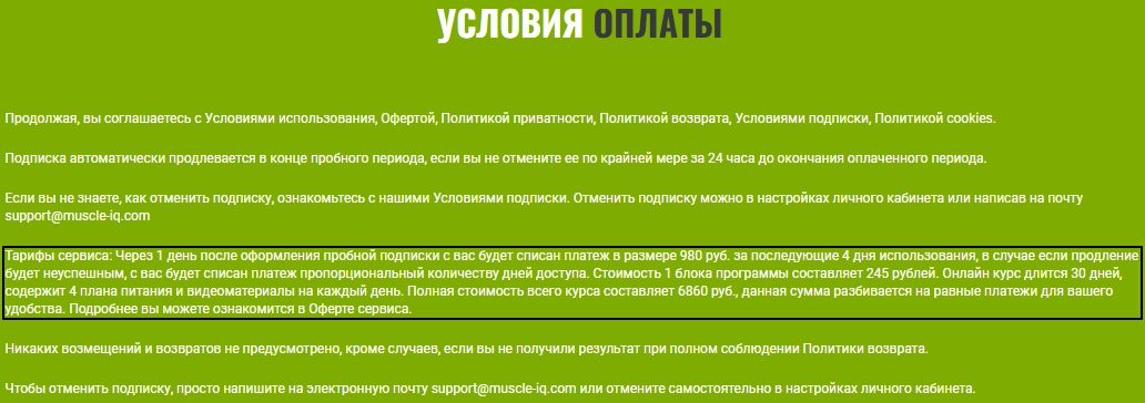 Например, оригинальный прайс на демо- и полный доступ идентичен и составляет 7980 рублей независимо от срока абонемента, а админы muscle-iq.com готовы знакомить с платформой буквально за бесценок. Верить их словам не стоит — в компании с эквайринговым сервисом https://pikassa.io жулики попросту наживаются на сборе автоплатежей за фактически навязанные услуги.