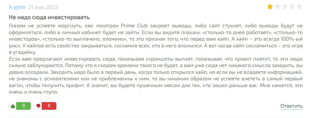 В сети много отзывов о https://prime-club.org, и все они отрицательные. Компания является финансовой пирамидой, так указано в реестре Банка России. Выплат клиентам не осуществляет, это является причиной негатива клиентов. Контора приобрела сразу несколько доменных имен и переносит платформу для избежания блокировок, но Роскомнадзор работает быстрее, поэтому сайт доступен только через VPN. При подаче заявок на вывод клиент не может связаться с представителями компании, они просто не отвечают на сообщения.