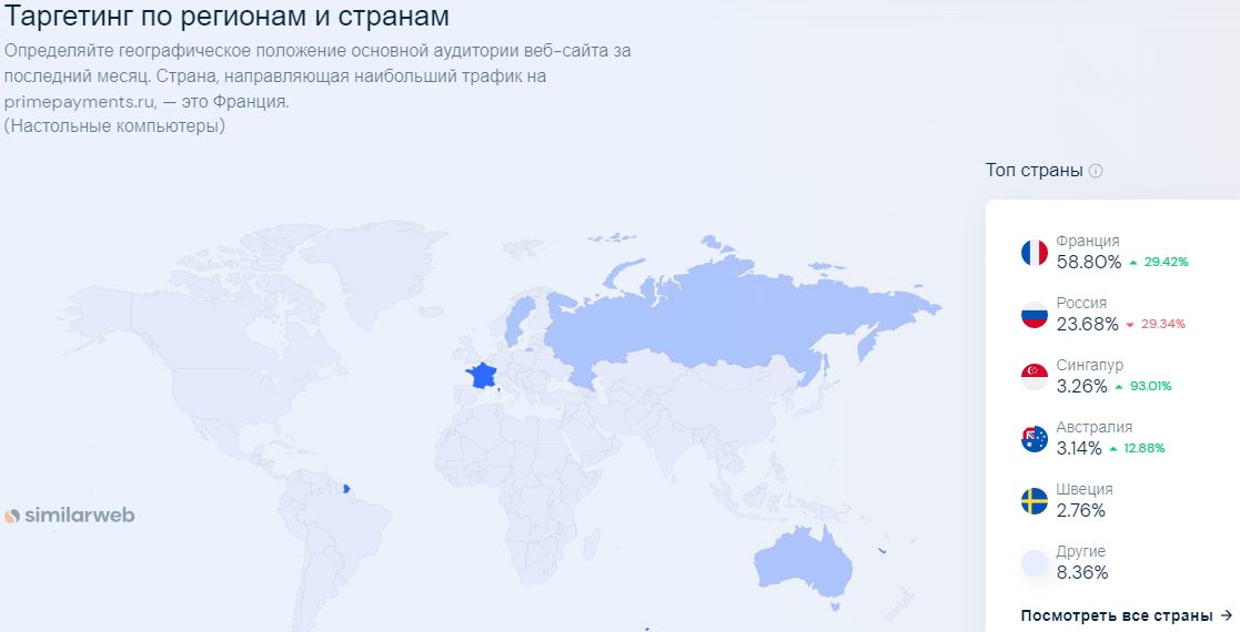 Несмотря на ориентацию на русскоязычных клиентов, 60 % аудитории приходится на французов, а число посетителей primepayments.ru из РФ едва достигает 25 %. Ресурс пользуется популярностью у жителей Австралии и Сингапура, однако число визитов с марта по май 2023 года сократилось в 3 раза.