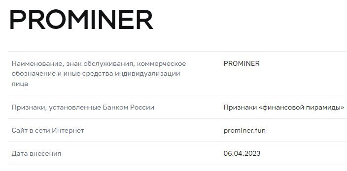 Промайнер представляет собой финансовую пирамиду или HYIP-проект. Они появляются, собирают деньги с наивной публики и быстро исчезают. В процессе могут делать небольшие выплаты первым клиентам за счет депозитов последующих. Без постоянного потока новых пользователей они перестают платить и закрываются. Prominer выставил такую высокую доходность, что не мог проработать долго. Банк России включил Промайнер в свой черный список, обнаружив у него признаки финансовой пирамиды.