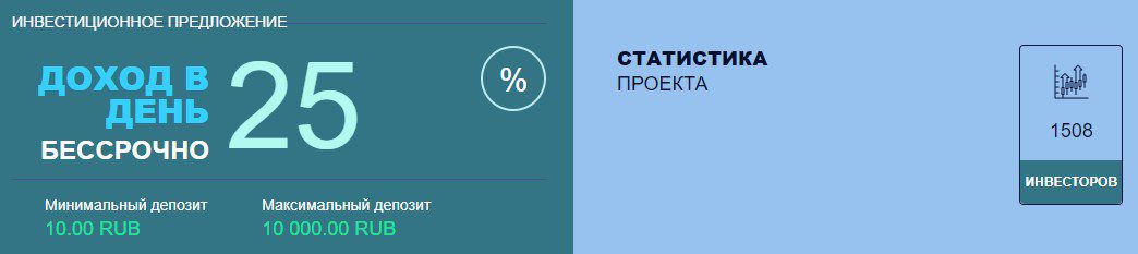 Предлагает своим клиентам несколько видов заработка. Основным является начисление пассивного дохода на вложенный депозит пользователя. Обещают целых 25% в сутки. Для этого нужно зарегистрироваться в один клик на главной странице, указав кошелек Payeer. После внесения депозита прибыль начнет капать автоматически, ее можно в любой момент выводить. Пополнить счет можно на сумму от 10 до 10 000 рублей. Минимальный вывод составляет 1 рубль.