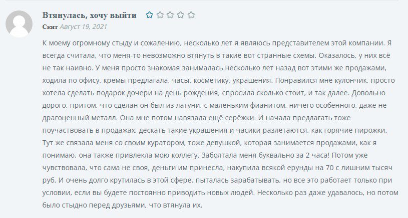 О том, что это за компания, отзывы сотрудников рассказывают очень красноречиво на страницах интернет отзовиков. Отрицательные отзывы встречаются параллельно с положительными. Реальные пользователи разоблачают сетевую структуру в мошенничестве. Они сообщают, что все начинается со звонков на телефон каких-то старых знакомых, которые просто хотят встретиться. Или с простых предложений на месте работы от сотрудников. В процессе этой встречи или общения с коллегой их подбивают прийти на презентацию в офис компании. Где психологически воздействуя, каким-то образом, раскручивают новеньких на вступление в эту секту и приобретение товара на очень большие суммы денег. А тех, кто не имеет таких больших средств, отправляют в банки за взятием кредита, и даже сопровождают их.