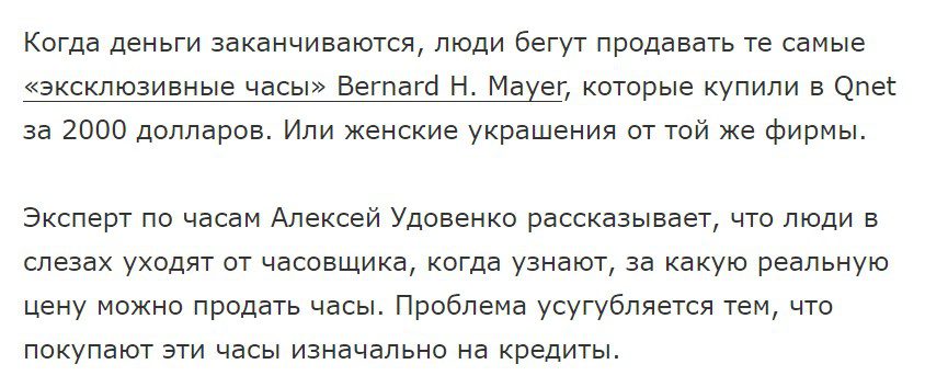 Отзывы людей о продукции Qnet, являются лишним подтверждением этого. Многие утверждают, что когда у них заканчиваются деньги, а товаров, приобретенных в лохотроне Qnet дома вдосталь. Они пытаются продать их или сдать в ломбард, например, украшения и часы якобы швейцарской компании Bernard H. Mayer. И там узнают истинную ценность этих предметов. А возврат товаров самой пирамиде не возможен.