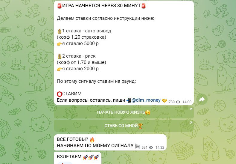 На канале закрыт доступ к комментариям, все вопросы можно задавать только при личном общении в другом аккаунте https://t.me/dim_money. Дмитрий регулярно организовывает командные раунды и дает подробные инструкции как делать ставки, но не дает никаких гарантий, что они будут выигрышными.