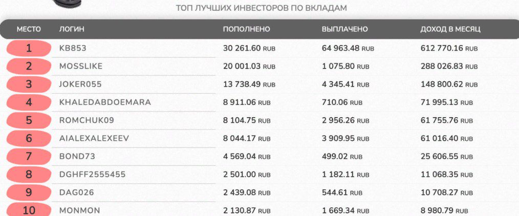 Дополнительно публиковались ники инвесторов, которые внесли больше всего денег, их суммы пополнений и снятий. Это должно создать ощущение активно работающего проекта. Цифры могут быть выдуманными, в реальности количество клиентов и полученная ими доходность неизвестны.