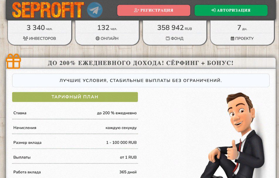 Вложения в HYIP максимально рискованные, это почти всегда заканчивается потерей денег. Sebank уже закрыт, в его группе в Telegram удалены все посты. По последнему адресу seprofit.pro сайт не открывается.