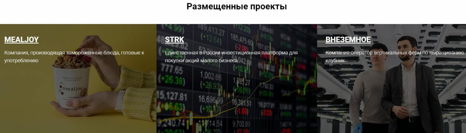 В качестве компаний для инвестирования на сайте представлены предложения стартапов малого и среднего бизнеса, которые привлекают 3000000– 50 000 000 рублей. Аудитория на сайте – розничные инвесторы с инвестициями от 50 000 до 10 000 000 руб. и дивидендами 20% годовых.