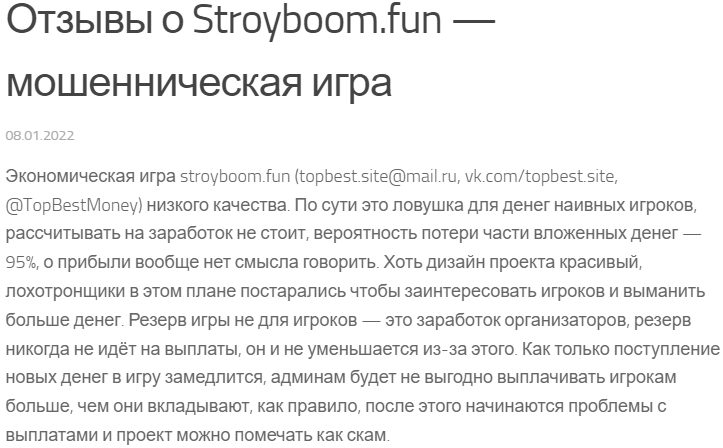 Отзывы о Stroy Boom с форумов наглядно подтверждают результаты расследования и бесполезность проекта, рассчитанного лишь на незаконное обогащение его руководителей. Единственный малопонятный момент — упоминание о «красивом дизайне» одним из авторов, что вряд ли соответствует реальности из-за явной ущербности одностраничников игры СтройБум.