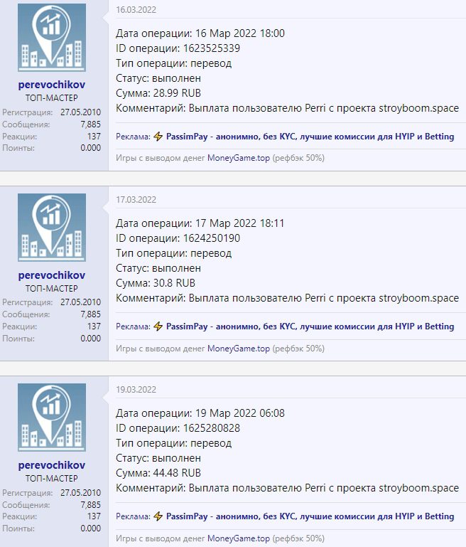 Свою ограниченность жулики демонстрируют в форме предложений поучаствовать в конкурсах и серфинге веб-страниц аналогично легальным буксам, однако в случае со Stroy Boom рассчитывать на серьезные дивиденды глупо. До марта 2022 года анонимы платили какие-то деньги для имитации законности деятельности, после чего отзывы о Строй Бум и выводах с лохотрона перестали публиковаться на форумах.Подобный финал можно было предвидеть заранее, однако посетители тематических сайтов все равно проверяли КПД хайпа за свои деньги. Величина выплат обычно не превышала 100 рублей, после чего мошенники исчезли с депозитами в неизвестном направлении.