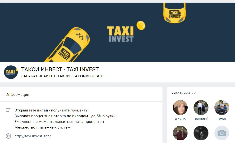 Такси Инвест – проект, где пользователям предлагают пассивный заработок на инвестициях в такси. В сутки обещают от 5% процентов прибыли. У проекта есть отдельная группа Вконтакте и сайт. Страницы в Инстаграме, канала в телеграмме и на Youtube нет. Мы проверили всю информацию и отзывы о Такси Инвест, и выяснили, можно ли им доверять.