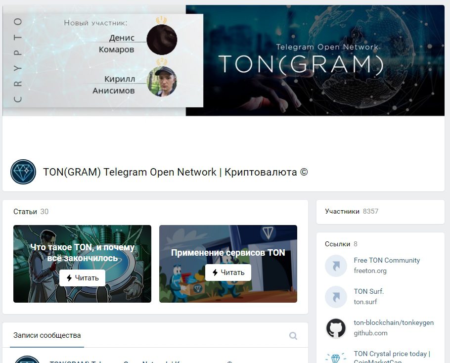 Самое интересное, что в группе вк Павел Дуров указывается как основатель проекта. Если почитать все его обзоры, то он отрицает свое участие в подобных проектах. Хоть Дуров и предоставил всю информацию в социальные сети, но Facebook продолжил пропускать и размещать рекламу мошенников от его лица. В группе публикуется информация о проекте, о всех этапах развития блокчейна и криптовалюты. Стоит отметить, что последняя запись была 30 мая 2020 года. Видимо их деятельность притихла и они выкачивают деньги уже непосредственно с помощью своего сайта. Численность подписчиков достигает 13 тысяч человек и основная масса — это фейковые аккаунты.
