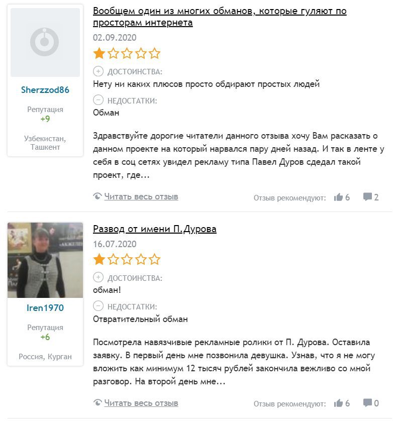 Поскольку за последние года ресурс пользовался спросом, то в интернете появилось очень много отзывов. На сторонних ресурсах оставляют в основном негативные рецензии. Люди массово теряют свои деньги, доверяясь словам, что проект ведет сам Дуров. Ведь как можно не верить человеку, который создал несколько полезных для мира ресурсов. Однако низ-за этой информации люди и попадают в яму.