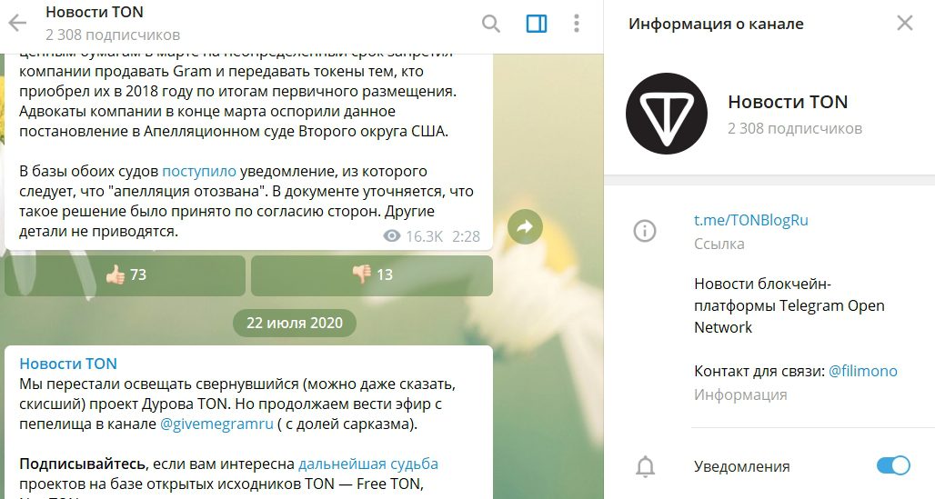 В Telegram канале выкладываются новости проекта блокчейн-платформы “Telegram Open Network”. Обзоры новостей крипто валютного рынка и все этапы развития компании. Почти в каждом посте упоминают причастность Павла Дурова.
