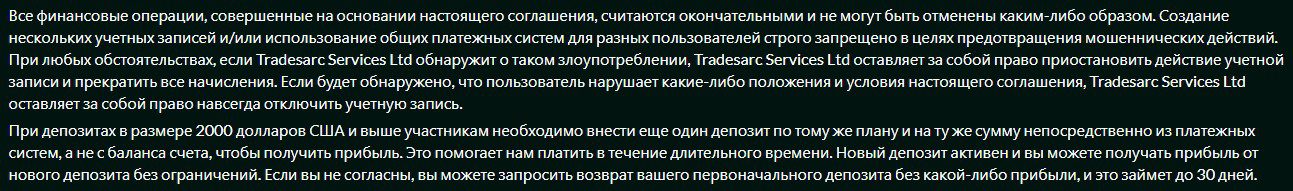Кроме этого организаторы проекта в любой момент без всякого объяснения и возврата денег могут заблокировать аккаунт клиента. В Правилах также прописаны некоторые условия, влекущие за собой дополнительные для клиентов вливания капитала.Tradesarc Services LTD: отзывы о ценах