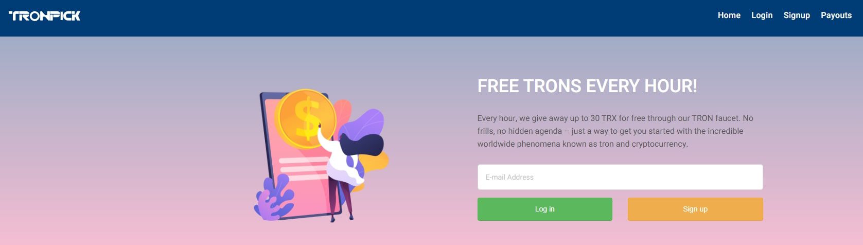 Tronpick.io – онлайн-платформа, где участники имеют возможность ежечасно получать бесплатные TRX (Tron). В качестве Tron-крана, этот веб-сайт предлагает вознаграждение в виде TRX за выполнение различных задач, таких как разгадывание капч. Пользователи могут получать до 30 TRX бесплатно каждый час через этот кран. В интернете некоторые пользователи утверждают, что платформа надежная, однако другие высказывают критику в адрес алгоритма начисления вознаграждений.
