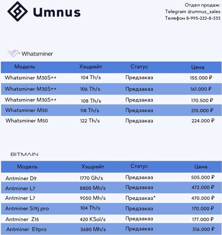 Иван Сухиасов также продает ASIC, последний прайс на которые варьируется от 155 до 505 тысяч рублей. По рассказам бизнесмена, майнинг с Umnus позволяет «печатать деньги» без лишних заморочек — для этого достаточно купить ферму и получать халявную прибыль с минимальной месячной ставкой в 60 %.