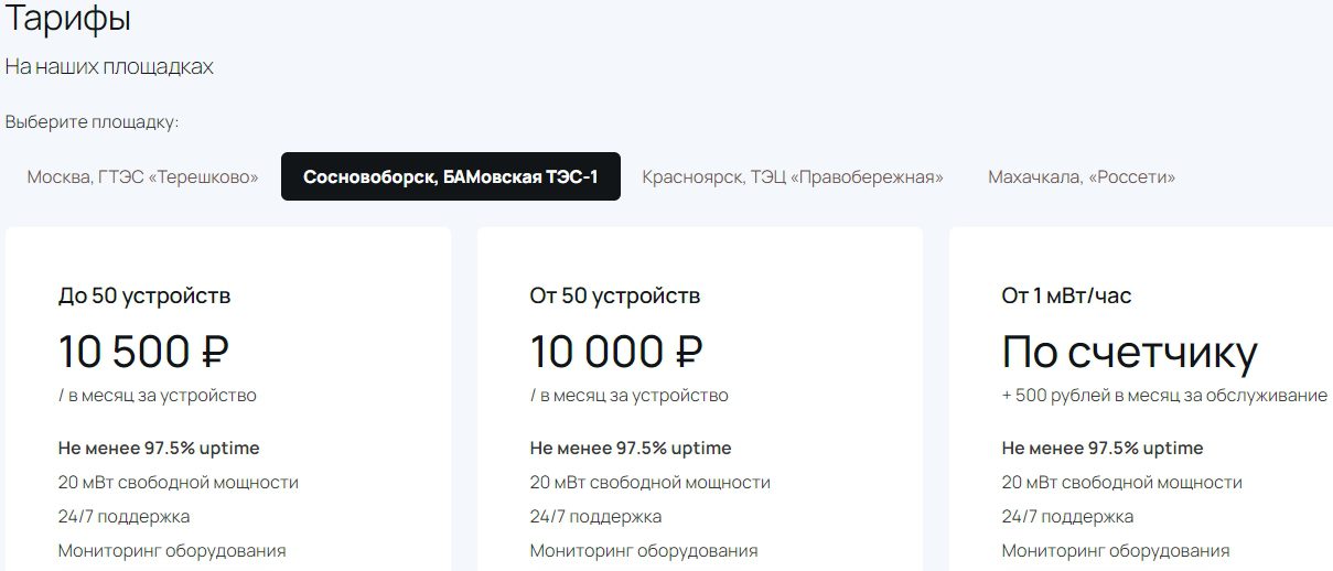 Топ-менеджер Умнус вышел на китайский рынок майнинг-ферм в 2017 году, открыв на текущий момент 3 дата-центра для размещения оборудования. Площадка в Махачкале пока в стадии запуска, а стоимость аренды площадей варьируется от 10 до 10,5 тысяч рублей за устройство независимо от города.