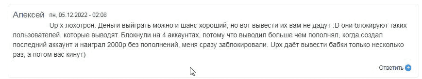 Заработок в Up x невозможен, что подтверждаются многочисленные негативные комментарии. Хотя на канале Up X в Телеге отзывы только положительные, они фейковые, ведь лента закрыта для публикаций от пользователей. В интернете обманутые клиенты Up X Телеги пишут о том, что потеряли от 2000 рублей и более, поскольку не смогли оформить вывод средств.