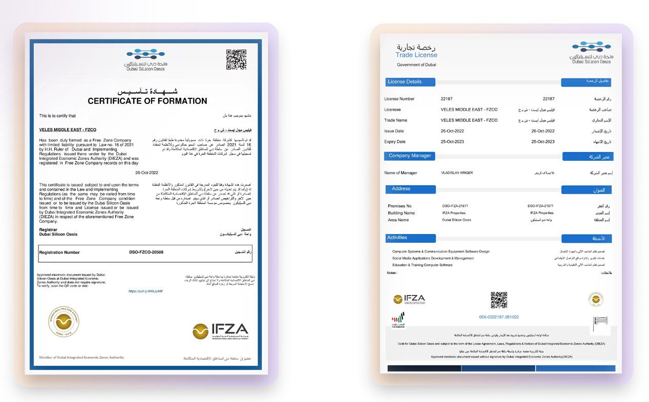 Единственный документ, который удалось найти на сайте Veles – это сертификат о регистрации компании в IFZA. Это свободное экономическое пространство ОАЭ. Однако лицензия IFZA не дает никаких гарантий надежности фирмы. Кроме того, на сайте организации не было найдено никаких данных о компании Veles. Следовательно, даже этот сертификат является фейковым.