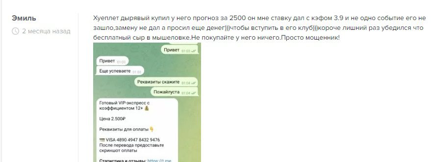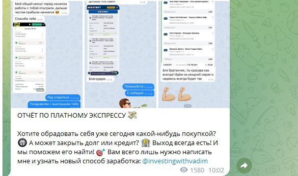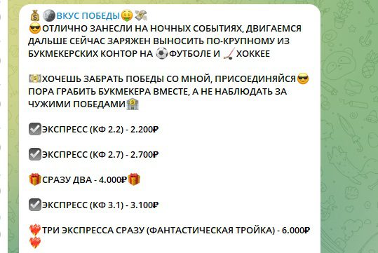 Телеграмм-канал Вкус Победы создан мошенником Investingwithvadim с единственной целью — развод начинающих беттеров на деньги. Прогнозы, которые он выдает, могут привести к потере финансов, а по совместным инвестициям выплаты не производятся. То что канал мошеннический подтверждают такие факты: