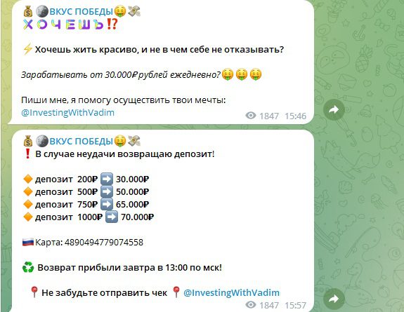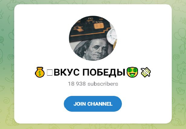Вкус Победы – Telegram-канал со спортивными прогнозами. Его админ Investingwithvadim предлагает заработок на инвестировании в совместные сделки или самостоятельные ставки по инсайдерским сигналам на договорные матчи, при этом гарантирует фантастическую прибыль 5-10 000%. Насколько правдоподобны подобные обещания и какие реальные заработки в БК — тема очередной проверки.