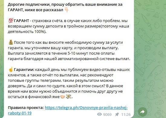 В ленте канала также часто появляются публикации со ссылкой на Правила работы, где кроме условий раскрутки указано, что для получения выплаты необходимо предварительно оплатить страховку Гаранту в размере 10% и налоги — 13%.