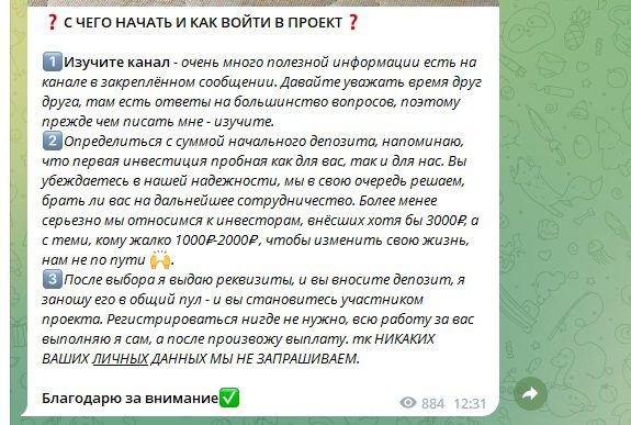 Главная услуга, которую предлагает Вадим — раскрутка счета на совместном инвестировании. Он регулярно размещает объявления с приглашениями изменить свою жизнь в лучшую сторону уже сегодня. По условиям, стартовать можно с суммы 200 руб. и заработать 30 000 руб.Чтобы не терять свое время на переписки, админ дает подробные инструкции об алгоритме совместной работы.