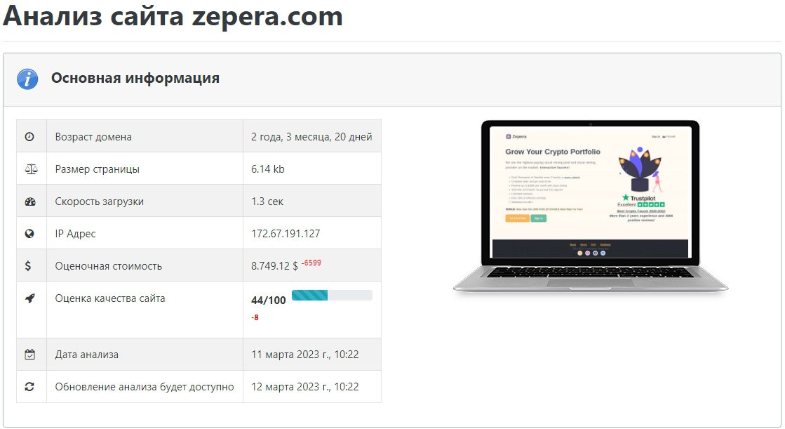 По данным SEO-аудита, на создание ресурса zepera.com разработчики истратили порядка 8800 $, разместив его сервера в канадском Торонто. Несмотря на это, более половины трафика приходится на жителей РФ и Украины, а установить местоположение офисов или личности админов стартапа невозможно.