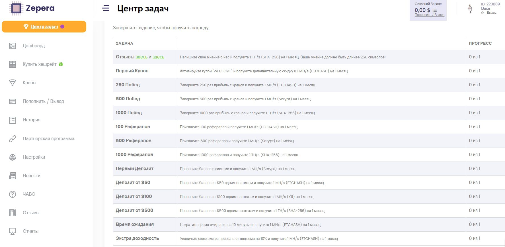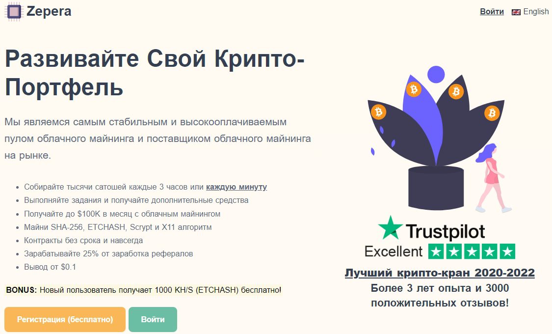 Начинать можно сразу после несложной регистрации, не требующей подтверждения по e-mail или привязки к номеру мобильного. Новичкам zepera.com выдается бонус в виде увеличения скорости майнинга Ethereum, а доказательством роста баланса выступает сомнительная инфографика, обновляющаяся в реал-тайме.