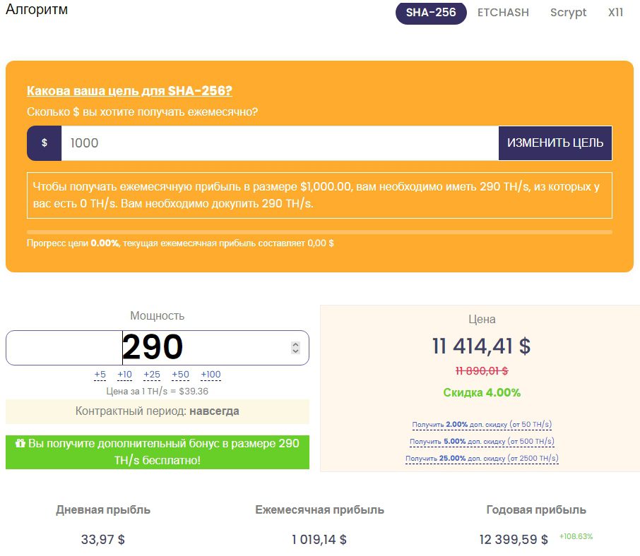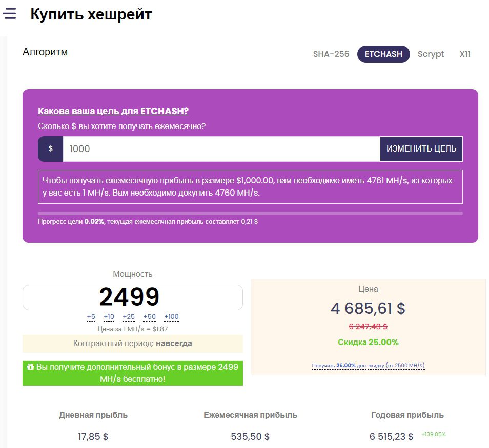 При выборе алгоритма ETCHASH для майнинга Ethereum аферисты советуют докупить хешрейт до 4760 MH/s, за что потребуется отдать порядка 9,3 тысячи долларов. В форме для ручного ввода нельзя выставить значение больше 2499 MH/s, что является уловкой для развода на двукратный платеж в размере 4685 $.
