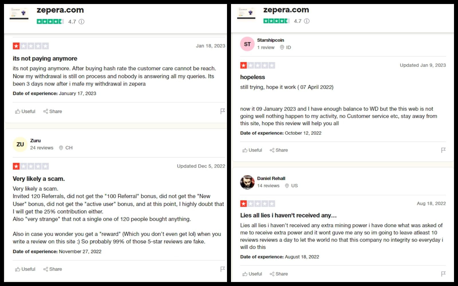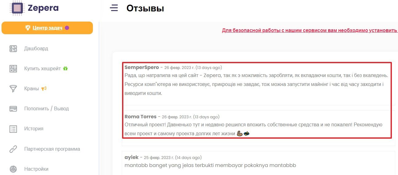 На популярном отзовике рейтинг HYIP-проекта зашкаливает, однако его админы не успели зачистить несколько реальных отзывов о zepera.com. Обманутые вкладчики рассказывают о блокировке вывода и разводе по реферальной программе, считая платформу стопроцентным скамом.