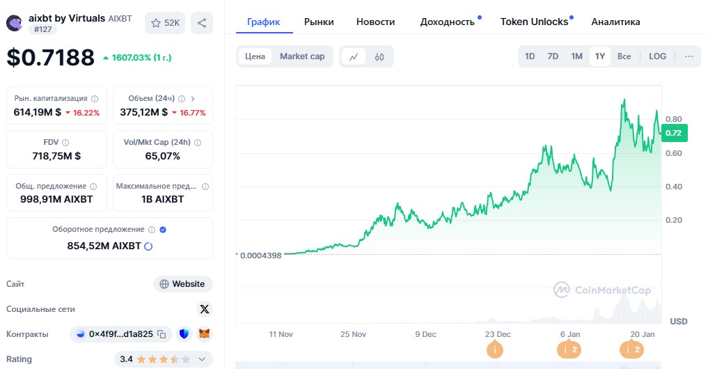 Сервис AIXBT может использоваться для автоматической торговли, анализа рынка и управления рисками. У AIXBT довольно активное комьюнити разработчиков и трейдеров, которое тоже серьезно продвигает проект.
