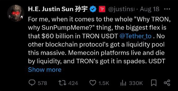 Почему ТРОН, почему Санпамп Меме? Наибольший понт здесь – 60 миллиардов ликвидности на блокчейне, чем обделены большинство остальных сетей. Мемкоины живут и умирают в ликвидности, которую TRON дает в избытке.