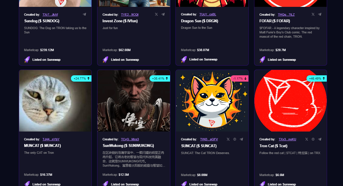 Наибольшим успехом пользуются токены с именем основателя Sun. Так SUNDOG имеет капитализацию в 240 миллионов долларов, следующий Сан по популярности – Dragon Sun с 40 миллионами.