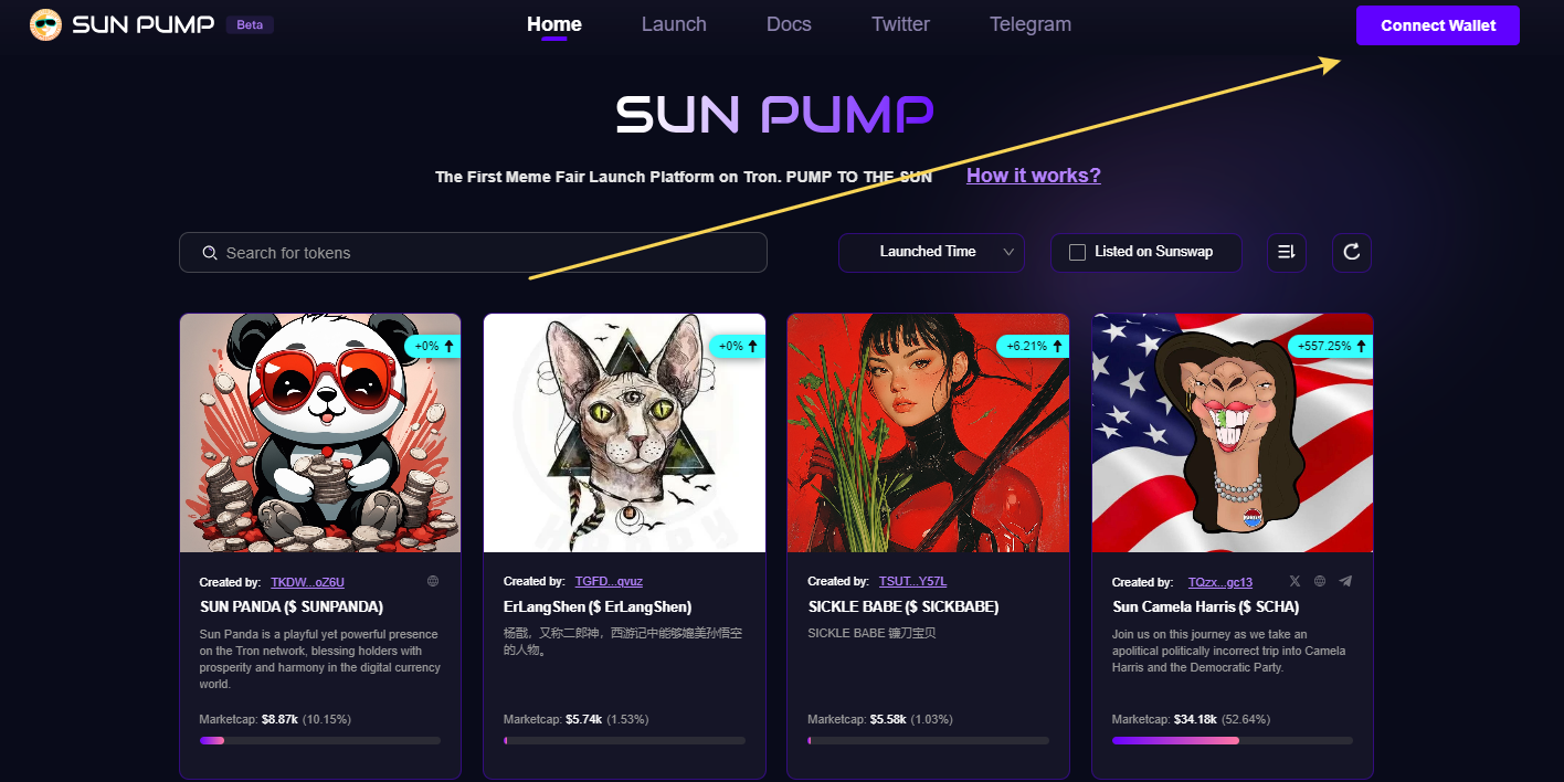 - Для начала заходим на https://sunpump.meme/, а далее в Connect Wallet.