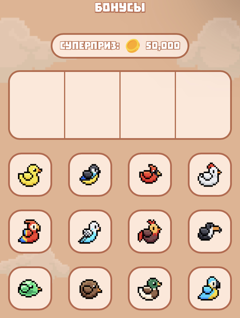 На этот раз 50 000 поинтов за комбо Bird Ton коина мы получим, собрав такую композицию: