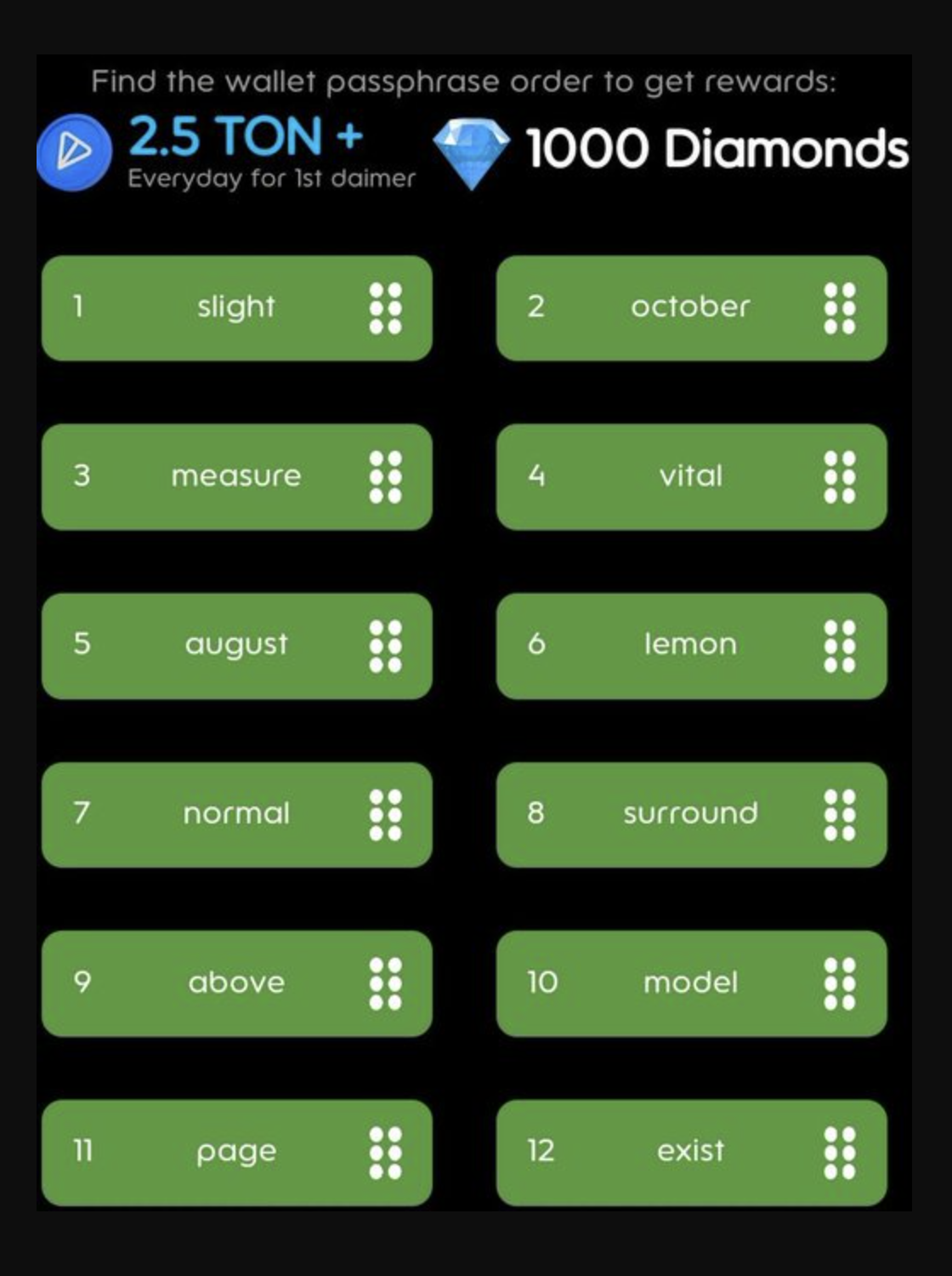 Для получения своего приза нужно правильно подобрать кодовую фразу, в которой содержится 12 слов. Если сделать всё верно, то игрок получает 1000 бриллиантов. Ниже представлена инструкция, как ввести комбинацию: