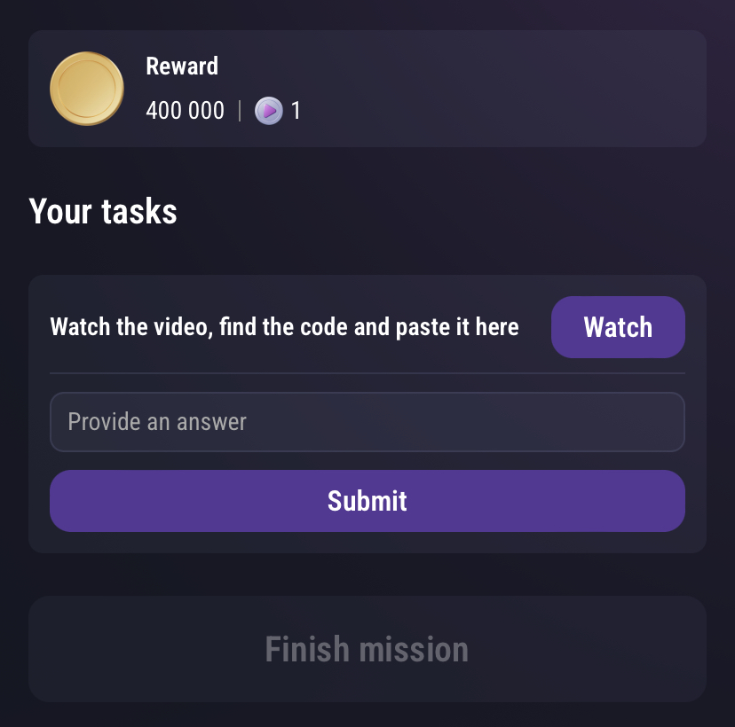 Перед вами откроется окно для прохождения миссии и ввода шифра. Здесь нажимаем на «Watch» и смотрим видео Тап Свап на сегодня.
