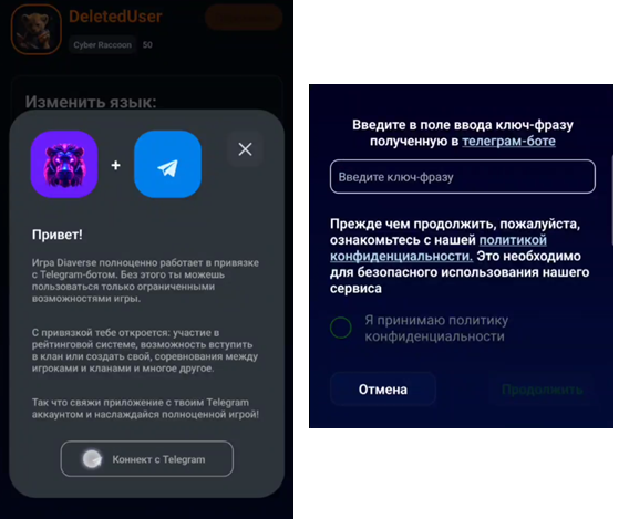 Этот ключ необходим для того, чтобы подключить приложение игры к телеграм-боту. Во всплывающем окне в Diaverse app необходимо нажать на «Коннект с Telegram» (если же окно не высвечивается при входе в приложение, можно зайти в опции и найти иконку Telegram). Далее вставляем тот самый ключ, соглашаемся с правилами пользования и нажимаем “Продолжить”. Таким образом, наш аккаунт в Diaverse должен быть связан с аккаунтом в Telegram.
