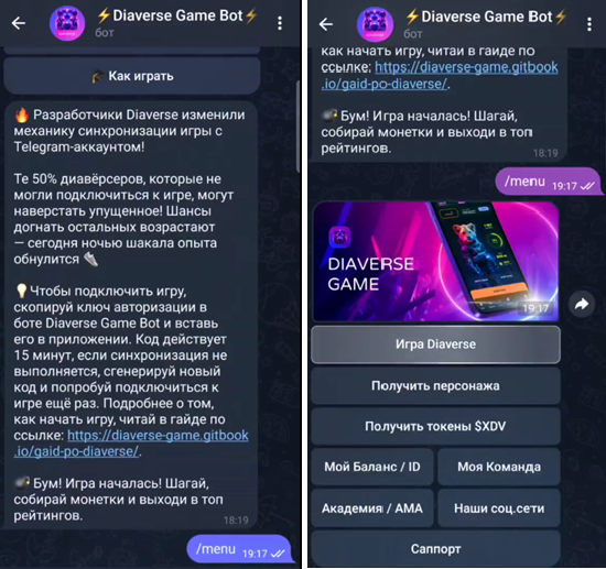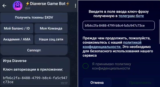 После установки приложения мы заходим в Diaverse Game Bot в телеграме, нажимая на «Игра Diaverse». Бот отправит сообщение, которое будет содержать ключ авторизации. Нажав на него, вы автоматически скопируете данные.