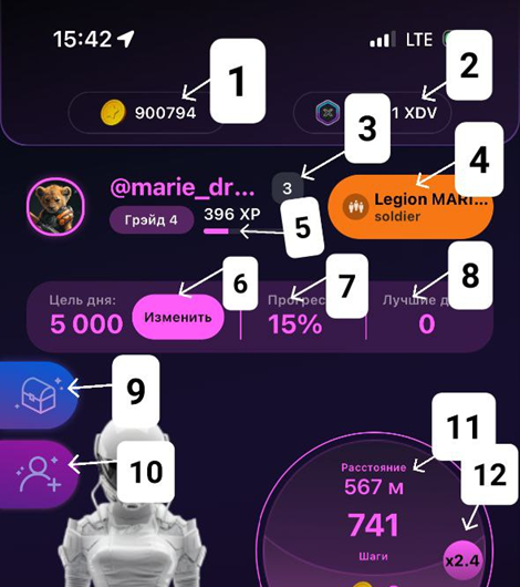 Вашим героем и персонажем, которым вы управляете, является пилот. Уровень вашего пилота в Diaverse увеличивается автоматически, исходя из количества пройденных шагов. Пока за сутки уровень может прокачать на 1500XP.