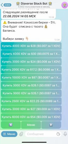• внутри самой игры есть возможность продавать и покупать токены XDV через бота @diaversestockbot, осуществляя торговлю монетами в Diaverse и внутриигровые покупки.